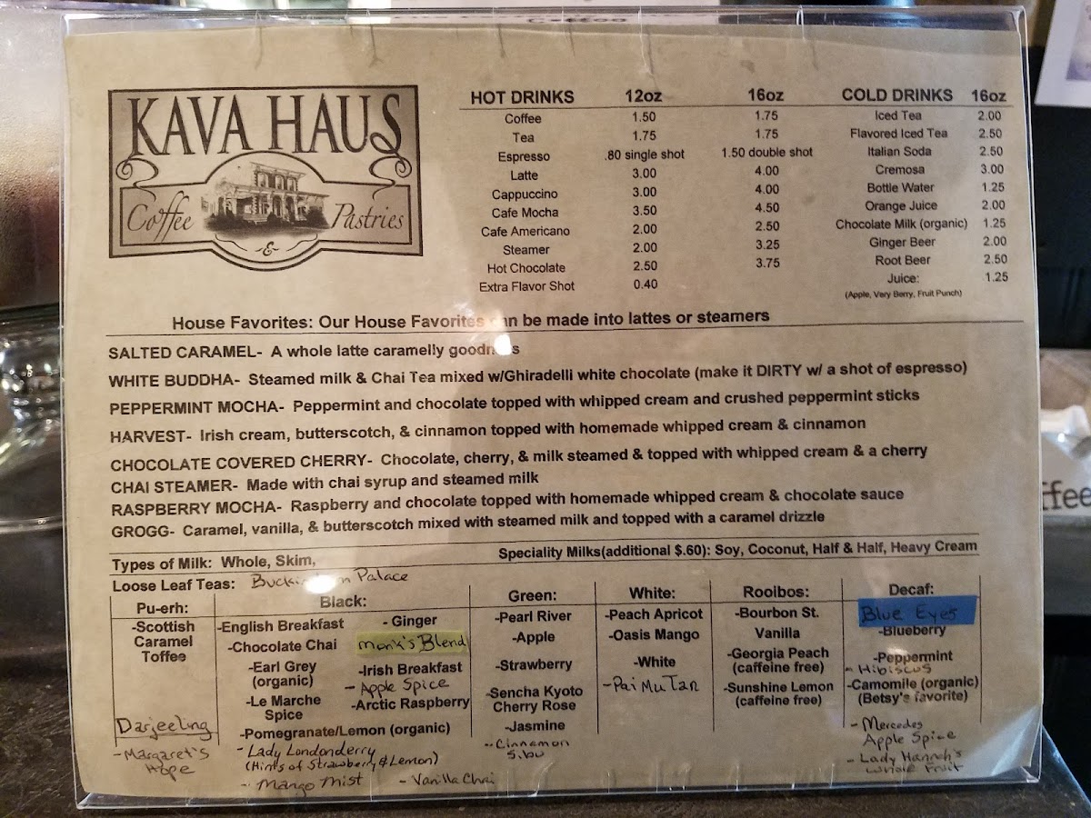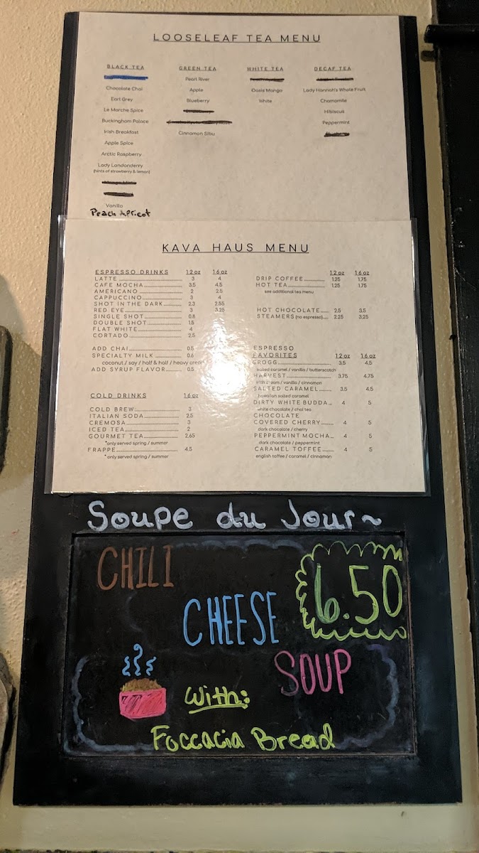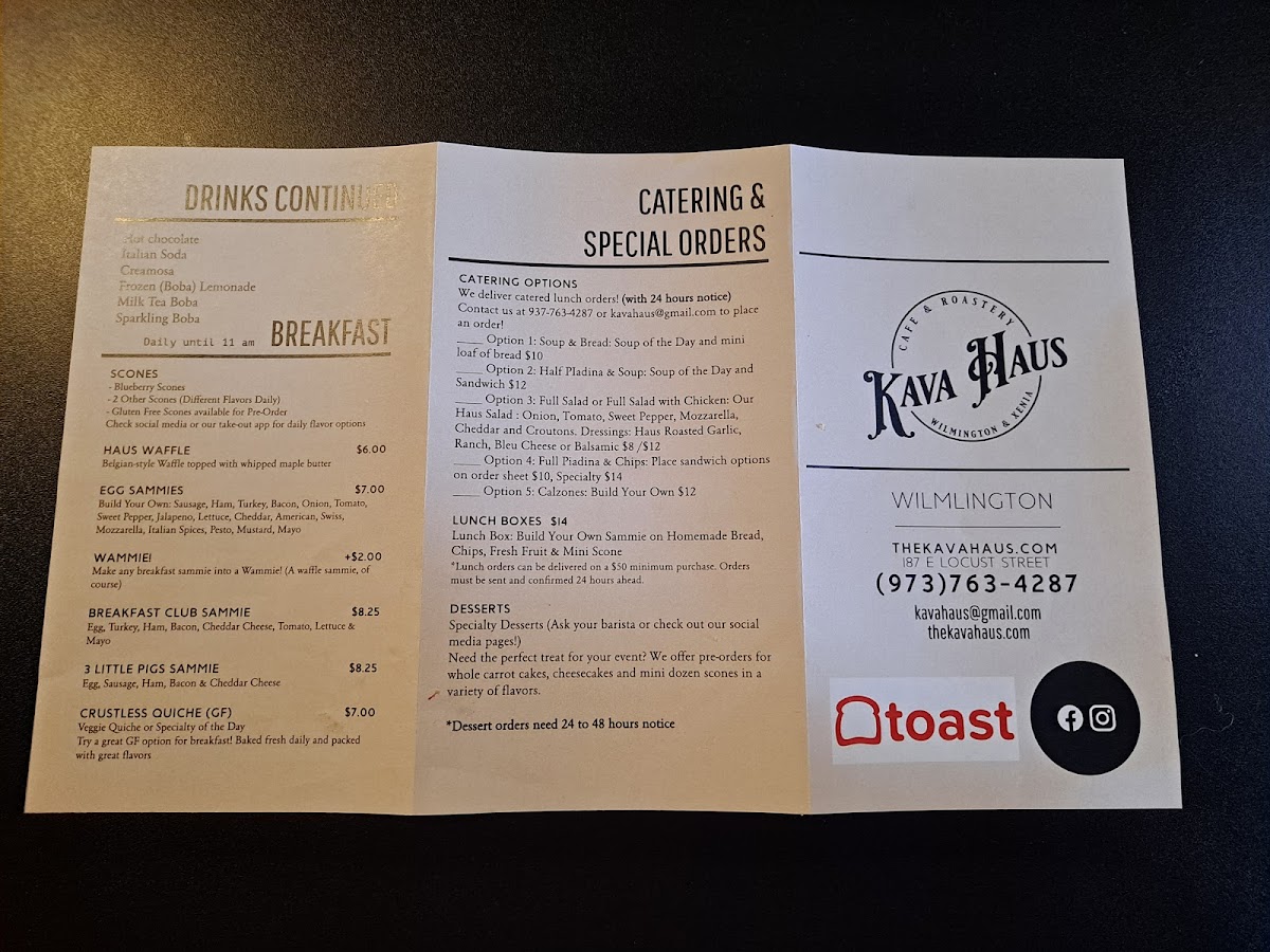 From a reviewer’s perspective, the menu at Kava Haus at 187 E Locust St, Wilmington, OH feels like a thoughtful summary of everything the café does best: comforting, handmade food paired with approachable drinks and a welcoming, community-driven vibe. The drink selection sets the tone with familiar favorites such as Coffee, Americano, Latte, Cafe Mocha, and Cold Brew, while the grab-and-go options like Sodas, Ginger Beer, Juices, Water, and Chocolate Milk make it easy to stop in no matter your schedule. On the food side, the variety is impressive, ranging from freshly baked Scones like Ginger Pear, Blueberry, White Chocolate Lemon Raspberry, and Sausage Jalapeno Cheddar, to hearty savory offerings including Pizza and Calzone. Breakfast and brunch clearly shine here, with crowd-pleasers such as Breakfast Sammie, 3 Little Piggies Specialty Sammie, Breakfast Club Specialty Sammie, Weight Boys Sammie, and Avocado Toast, alongside indulgent waffles like Haus Waffle, Hangover Buster, Cinnamon Roll Waffle, Smores Waffle, and Red Velvet Waffle. Weekly and seasonal highlights like Beer Cheese Soup & Pretzel Flats, Buffalo Loaded Mac N Cheese, and Loaded Mash add comfort-food appeal, while lighter or customizable choices such as Build Your Own HALF Piadina, Build Your Own FULL Piadina, and Half Piadina & Soup balance the menu nicely. The bakery case rounds everything out with Cinnamon Rolls, Sticky Buns, Overnight Oats in flavors like Brown Sugar Cinnamon and Peanut Butter Banana, plus treats like Espresso Brownie, Specialty Brownie (Buttercream And Sprinkles), cookies, and breads. Overall, the menu feels cohesive and generous, making Kava Haus a place where guests can enjoy anything from a quick coffee and pastry to a full brunch spread, all wrapped up in a warm, local café experience.